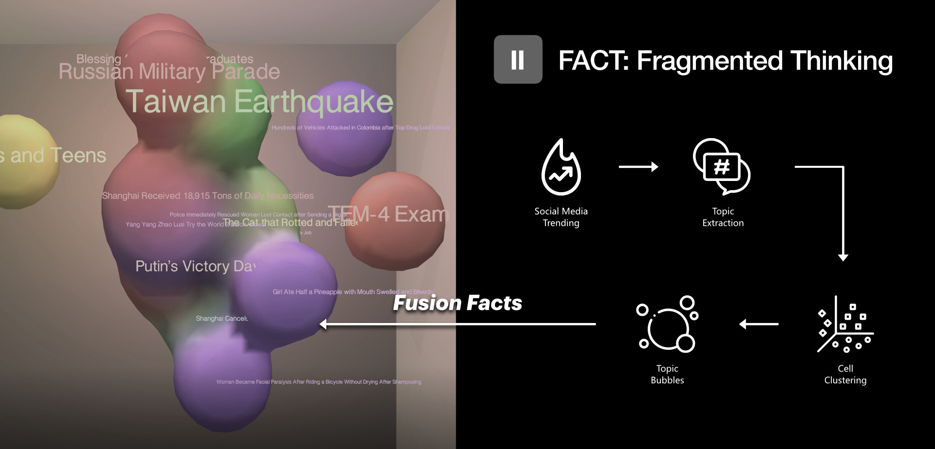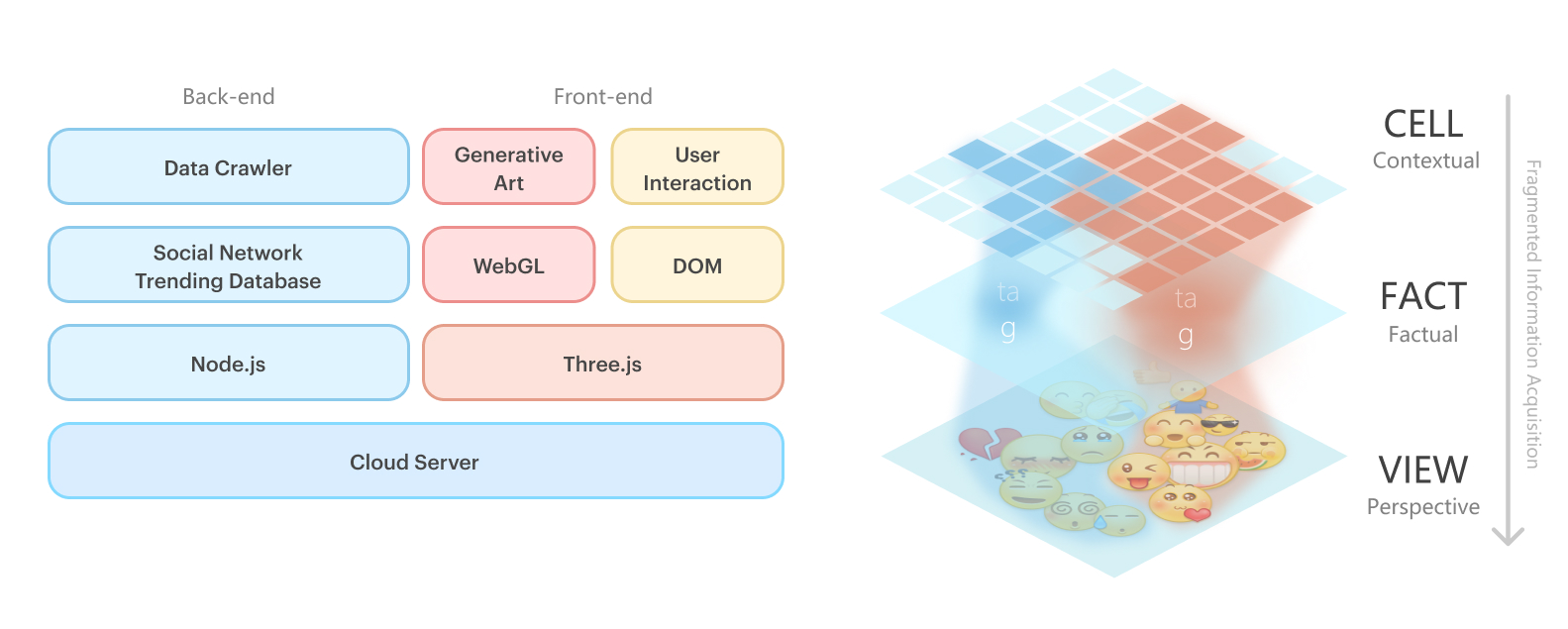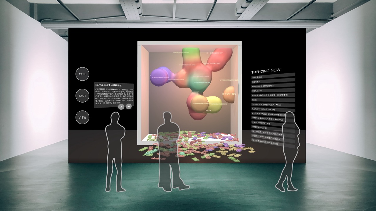 Affective words and emojis are extracted from the comments of trending posts using lexical and semantic analysis. As the user dives deeper into the content of the trending topics and interacts with them, affective words fall out of the topic bubbles and accumulate in the space naturally. Furthermore, if the user clicks the like button of a certain topic, which indicates that the user somehow endorses the content, emojis stickers extracted from the corresponding comments scatter in the design space and the sensibility of the cells possessing the topic is enlarged in the first layer of cellular automata. The semantic information exhibits phenomenon of fusion and disappearance of different information in reading fragmentation. And the sentimental feedback helps to arouse resonance from personalized generative art, which further stimulates behavioral reflection after the interaction experience.