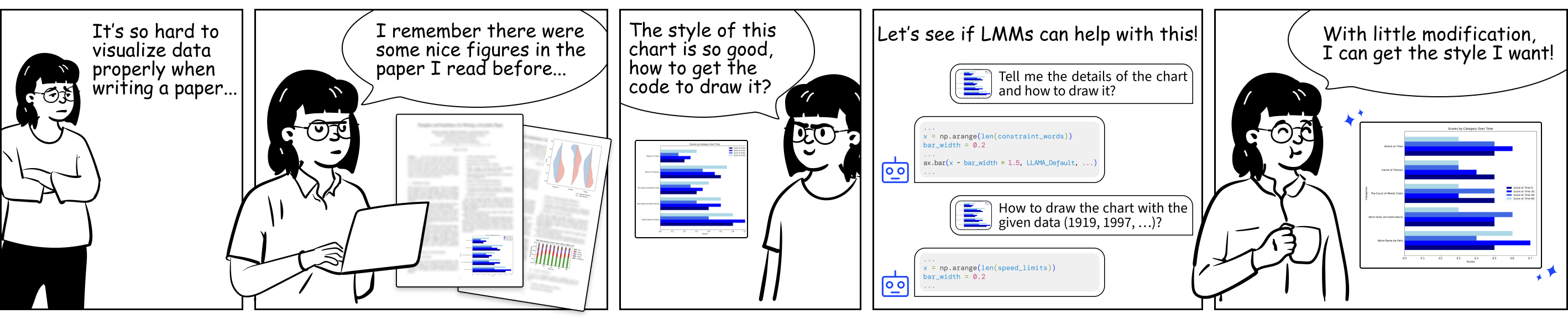 We introduce a new benchmark, ChartMimic, aimed at assessing the visually-grounded code generation capabilities of large multimodal models (LMMs). ChartMimic utilizes information-intensive visual charts and textual instructions as inputs, requiring LMMs to generate the corresponding code for chart rendering.