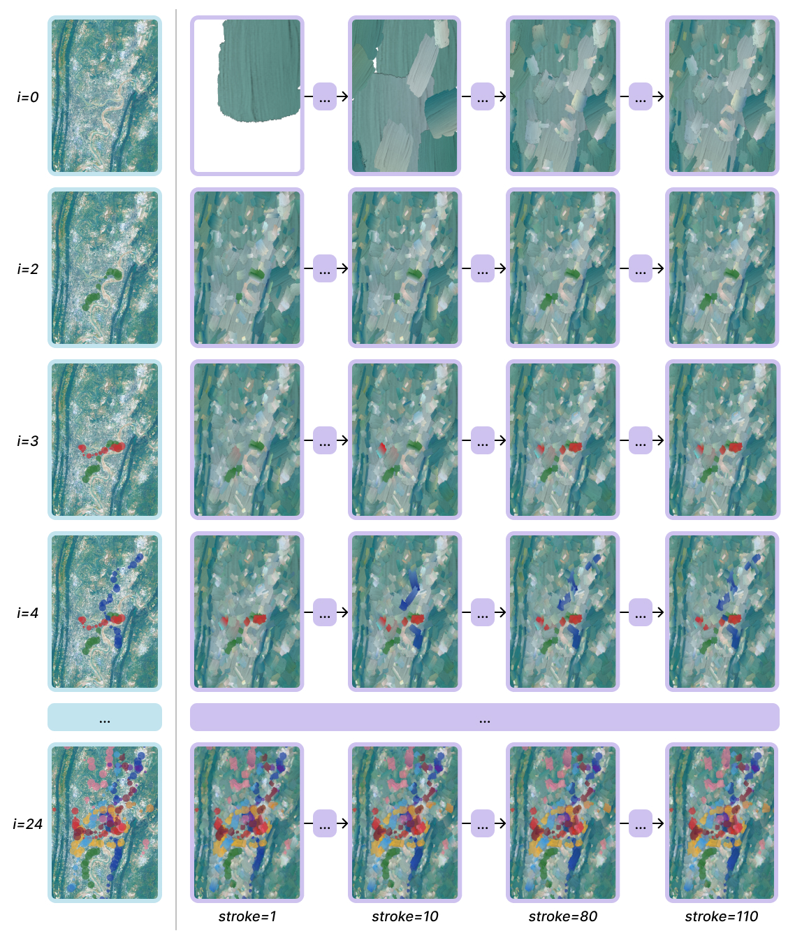 For each reference image, we iteratively generate 110 strokes on the canvas. The thumbnails of the canvas after stroke 1, 10, 80 and 110 are shown in Figure 6. Since we use the generated image from the previous iteration as the base for the next iteration, the painter utilizes the background layer to predict strokes. The resulting strokes exhibit a color blending feature between the background and new reference images, which enhances the authenticity of the generated oil painting.